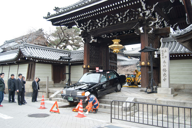Strolling through town with my camera at the ready I never actually dreamed of an opportunity like this! At the Higashi Hon Ganji temple a taxi driver scratches his head while a man of the Japanese AA tries to pry his car loose from the temple stairs, with danger to his own safety it seemed to me. Imagine what a shock it must have been for him, and his 'load'! The onlookers thought it all quite funny though and of course many cell phones whirred also into action :)